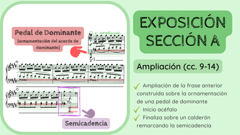 Tras la semicadencia aparece este nuevo elemento fraseológico que se construye, de principio a fin, sobre una pedal de dominante (aunque en la voz superior también se encuentra otra pedal de dominante a partir de las semicorcheas). Son las dos voces restantes las que forman una serie de intervalos armónicos de sextas, es decir: por un lado la voz de la mano izquierda a corcheas y por otro, la voz interna que aparece en la mano derecha con las semicorcheas que suenan en las fracciones fuertes, rítmicamente hablando. Y abro paréntesis, porque este recurso de mover paralelamente intervalos de 6ª no va a ser la primera vez que lo veamos en la obra. Cierre paréntesis. El hecho de tener estas voces moviéndose de forma paralela y dependiente una de otra y las notas pedales hacen que este pasaje se pueda entender como un fragmento horizontal y melódico, más que vertical y armónico. Sumado al hecho de que todo se construye sobre una larga pedal hace determinar que, por un lado, su sintaxis armónica se resume en un largo acorde de dominante con sus ornamentaciones y, por otro lado, que no es un elemento melódico nuevo e importante si no una ampliación de la frase anterior, de a1. De hecho, se vuelve a finalizar sobre una dominante y, por lo tanto, otra semicadencia del c. 14, confirmando de alguna manera que este pasaje era sólo una extensión. Aunque esta vez la semicadencia constituye un reposo más contundente que antes ya que posee un calderón que alarga esta breve pausa sobre la tensión sin resolver. Cabe señalar que el uso de pedales, especialmente la de dominante, va a ser un rasgo común y unificador en todo el movimiento.