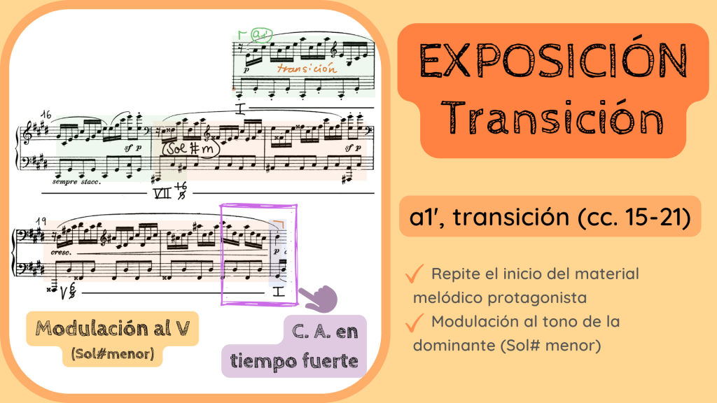 La resolución llega con el compás siguiente en el que escuchamos, de nuevo, el inicio del material protagonista, por eso la hemos denominado como a1’. Lo que en principio parece ser una repetición del tema acaba por transformarse en una transición, ya que en este pasaje Beethoven aprovecha para modular de forma definitiva, como se apreciará más adelante, hacia el tono de la dominante, a Sol# menor. Aquí aparece un elemento estructural fuerte y claro que marca la separación entre la transición y la Sección B que está por venir. Nos referimos a la Cadencia Auténtica sobre el tiempo fuerte del c. 21, la primera que vemos desde el comienzo del análisis.