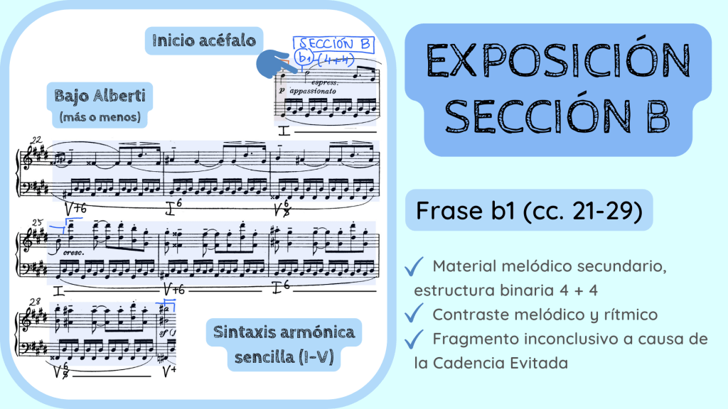 El nuevo tema es de apariencia clásica lo cual se observa en varias de sus características. Primero, la melodía es clara y forma una frase binaria y simétrica (con 4 + 4 en su estructura) y de semifrases paralelas (con la repetición de la misma melodía pero de forma ornamentada, conservando el inicio acéfalo y final fuerte). Segundo, el patrón de acompañamiento es uno de los más habituales del Clasicismo, el Bajo Alberti (aunque a medida que avanza la frase b1 vamos a ir viendo alguna que otra modificación en él). Y tercero, la sintaxis armónica es muy sencilla, con una clara alternancia entre dominante y tónica.