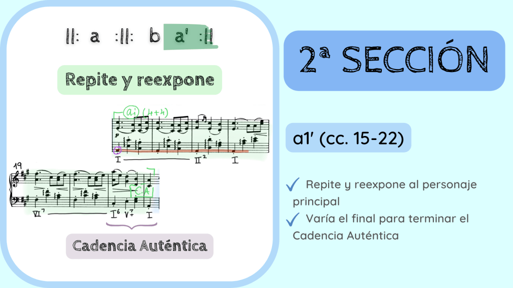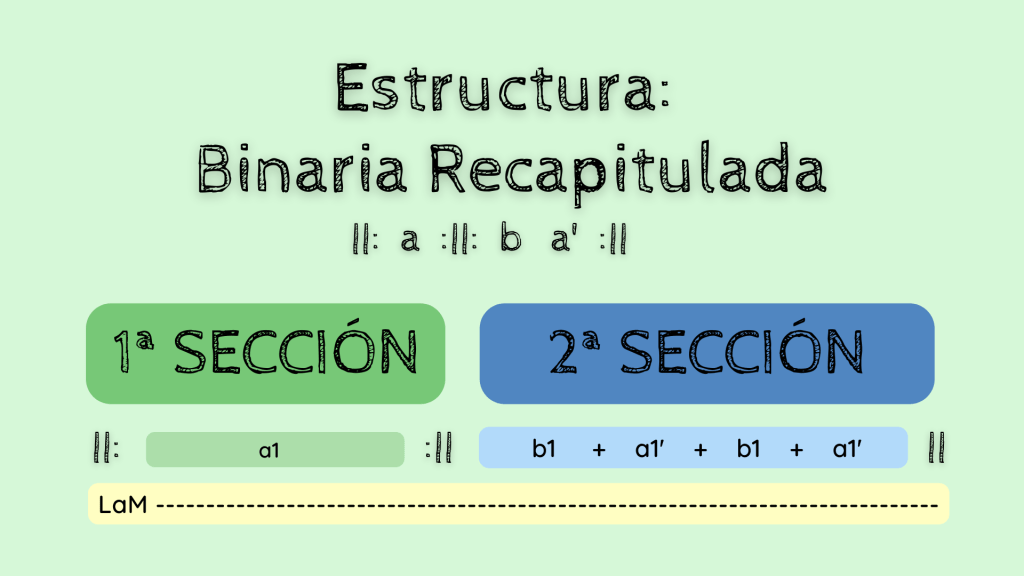 Y aunque al final del vídeo hablaremos de la estructura vamos a comentarlo desde ya porque estamos ante una Forma Binaria Recapitulada y es la principal razón por la que no he escrito Sección A, como acostumbro a hacer en mis análisis, sino que la he denomino como 1ª Sección. La particularidad que tiene la Forma Binaria Recapitulada es que contiene una única idea musical y que la obra se divide en dos partes en las que ambas trabajan con esa misma idea. Es por ello que no hablamos de Sección A y Sección B, porque además, tampoco suele existir en estas formas una clara modulación.