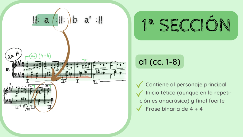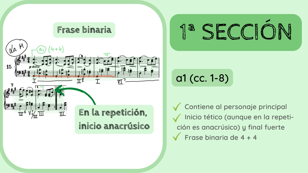 Es curioso destacar que esta frase, como se repite por las dobles barras tiene una variación en su inicio. La primera vez que se escucha su inicio es tético, en tiempo fuerte. Pero, ¿qué ocurre al repetirse en el c. 8, en la primera casilla de repetición? Pues lo que ocurre es que aparecen esas tres corcheas marcadas en la diapositiva que forman una anacrusa. Esto no suele ser habitual ya que si una frase tiene carácter tético, anacrúsico o acéfalo, lo suele mantener cada vez que se reaparece dicha frase. Pero sigamos viendo más características de esta frase a1.