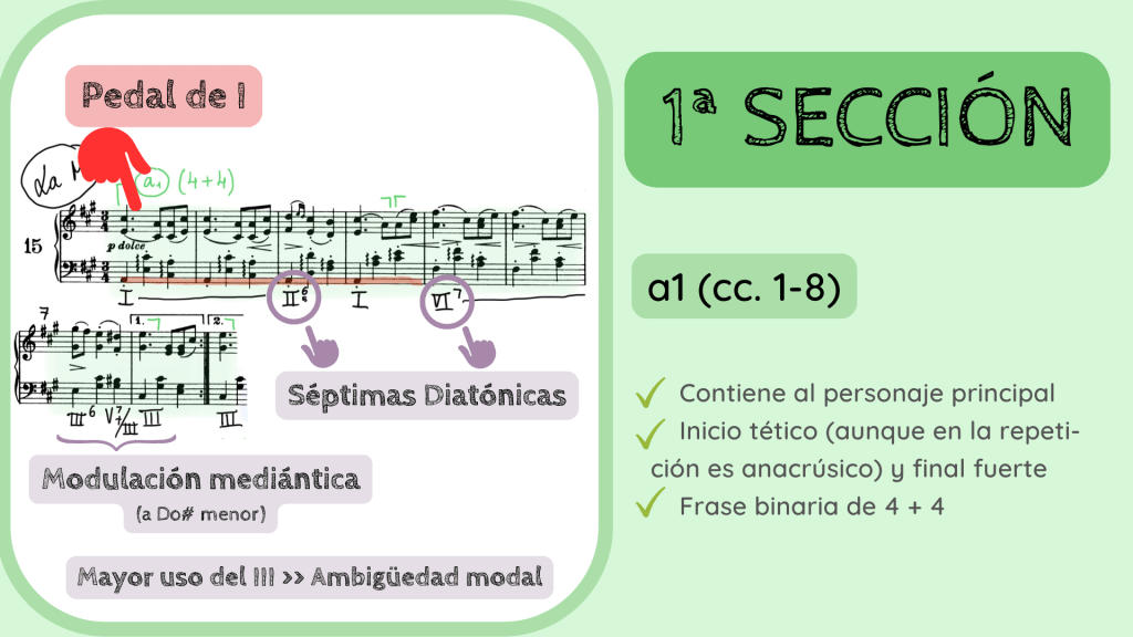 He anotado arriba de la diapositiva el esquema de la estructura binaria recapitulada para que vaya marcando el punto estructural de la pieza por el que vamos en el análisis. En este caso, el vals se rige como el modelo de la estructura, por unas dobles barras de repetición donde se escuchará dos veces la frase a1.