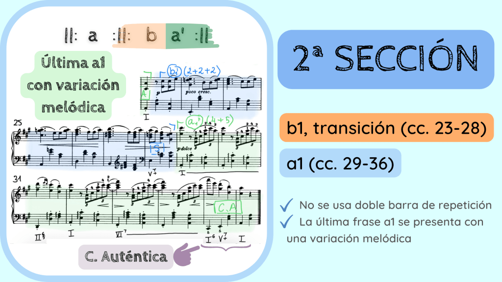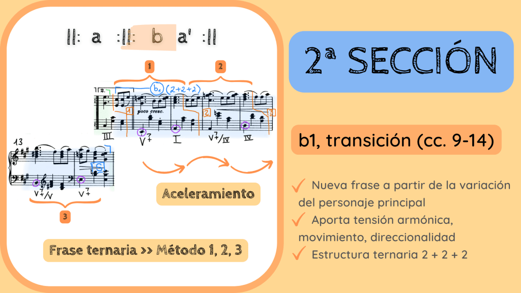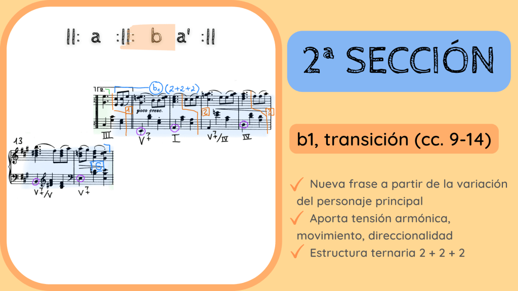 Después de lo anterior la 2ª sección se inicia con la frase b1. Esta doble barra tiene una función estructural y es la responsable de que la forma sea binaria. Y es importante recordar que, en esta estructura la frase b1 siempre tiene un carácter de transición ya que su función es la de llevarnos del personaje principal a1 hacia su repetición. Y, además, su esencia es el desarrollo de la idea principal. Vamos a ver sus características.