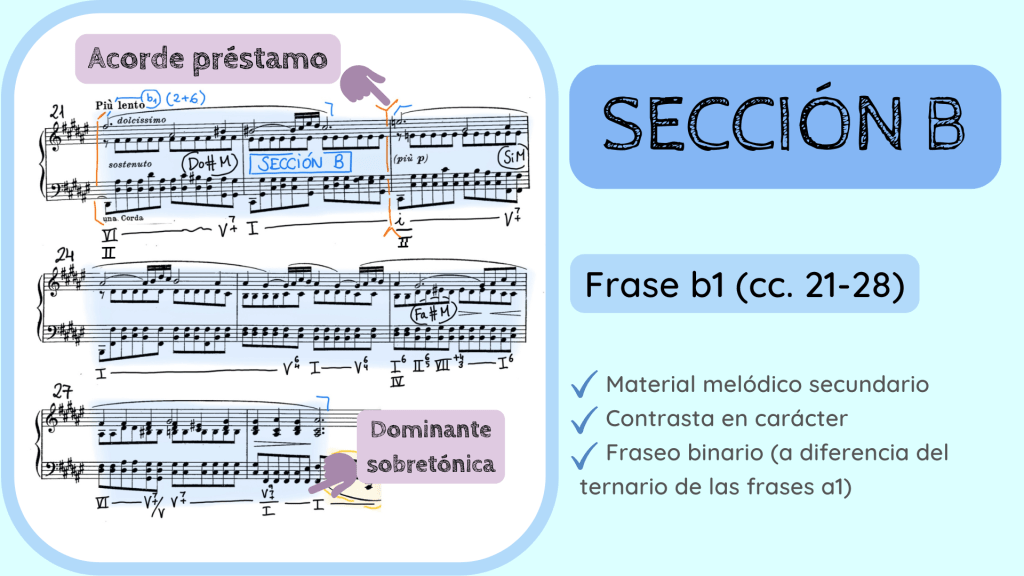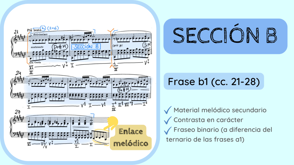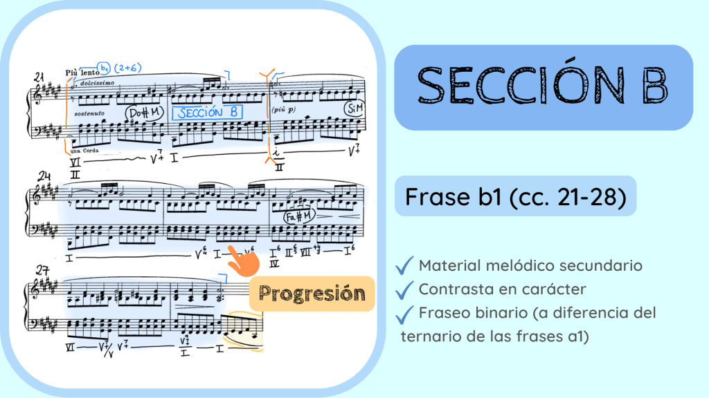 Tenemos por tanto una nueva Sección B y una nueva frase b1 que tiene una estructura binaria de 2 + 6 con unas semifrases asimétricas. Además se puede decir de ellas que son claramente secuenciales ya que entre los cc. 21-22 y 23-24 se establece una progresión en donde todo, melodía y armonía, se transporta una 2ª Mayor descendente. La diferencia la encontramos en que la repetición del modelo, los cc. 23-24 se extienden y alcanzan su cadencia en el c. 28 produciendo esta frase asimétrica que hemos comentado.