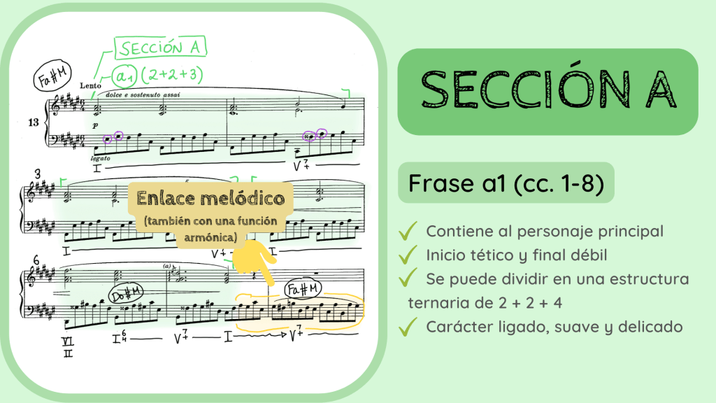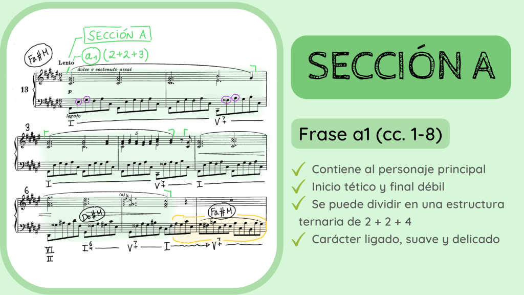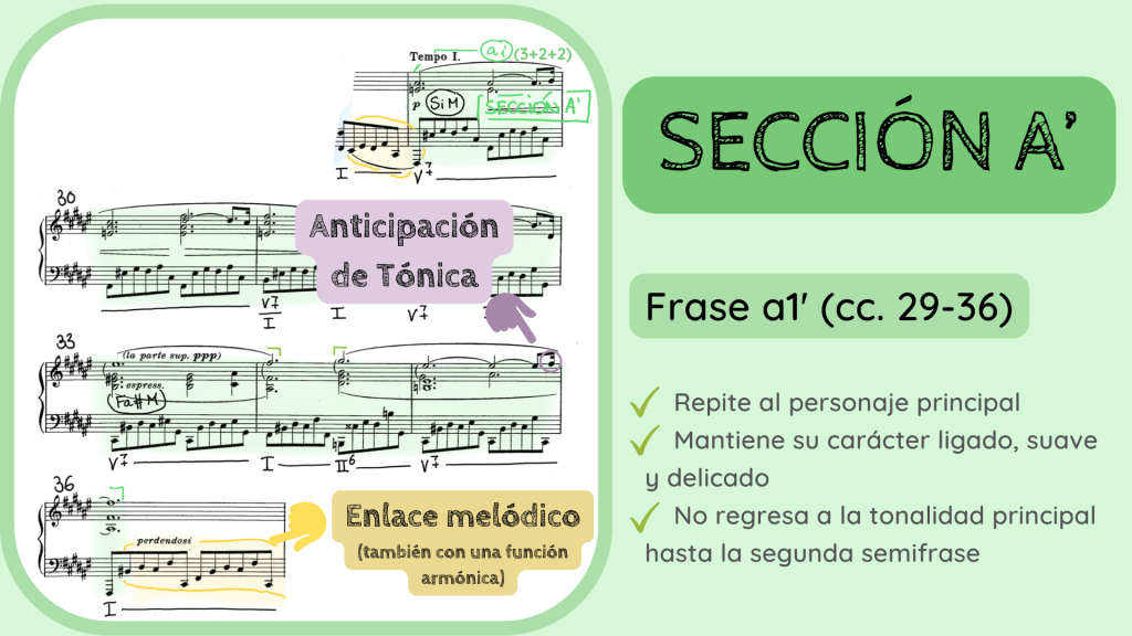 Y así volvemos a la Sección A’. Se nos vuelve a presentar el mismo patrón de acompañamiento que habíamos escuchado y la línea melódica recuerda, al menos en su inicio, al tema principal. Esto hace que denominemos a la frase a1 y se recupera su estructura ternaria de 3 + 2 + 2. Lo único que es poco común en esta reexposición del protagonista es su sintaxis armónica ya que no se regresa, desde el principio, a la tonalidad principal. Aunque durante el inicio en el que el bajo sí tenemos la nota Fa# ésta no aparece como Tónica de la principal sino como nota Dominante de Si Mayor. A partir del c. 32 la armonía modula a Sol# menor y, por fin, en ese mismo compás y por acorde puente, se vuelve finalmente a Fa# Mayor.