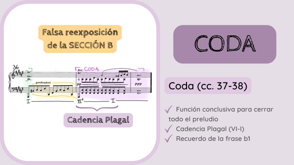Aparece esta coda final que se le puede atribuir la intención de una falsa reexposición de B ya que, su aparición con la vuelta al patrón de acompañamiento de dicha Sección, podría dar a entender que íbamos a escucharla de nuevo. Sin embargo, enseguida se corta realizando, lo que también es un guiño hacia el estilo Barroco, el uso de una Cadencia Plagal entre el VI con función de subdominante y la Tónica.