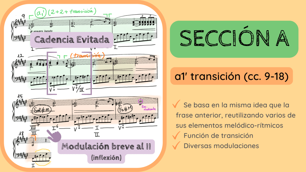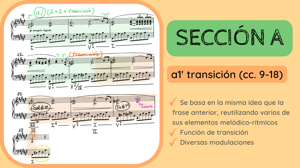 La siguiente frase se inicia con lo que, en principio, es una repetición del personaje principal. Las sorpresas, a nivel armónico, comienzan a llegar a partir del c. 13 cuando la tonalidad se desplaza hacia tonos vecinos como es la dominante secundaria del IV, de Si Mayor y, posteriormente, la modulación a Sol# menor, el II de la principal. No obstante, la frase finaliza con un regreso a la tonalidad principal de Fa# Mayor. Es por ello que esta frase, por la inestabilidad de su armonía, se le puede adjudicar una función de transición, pero está incluida dentro de la Sección A por el hecho de que finaliza sobre la tonalidad principal.