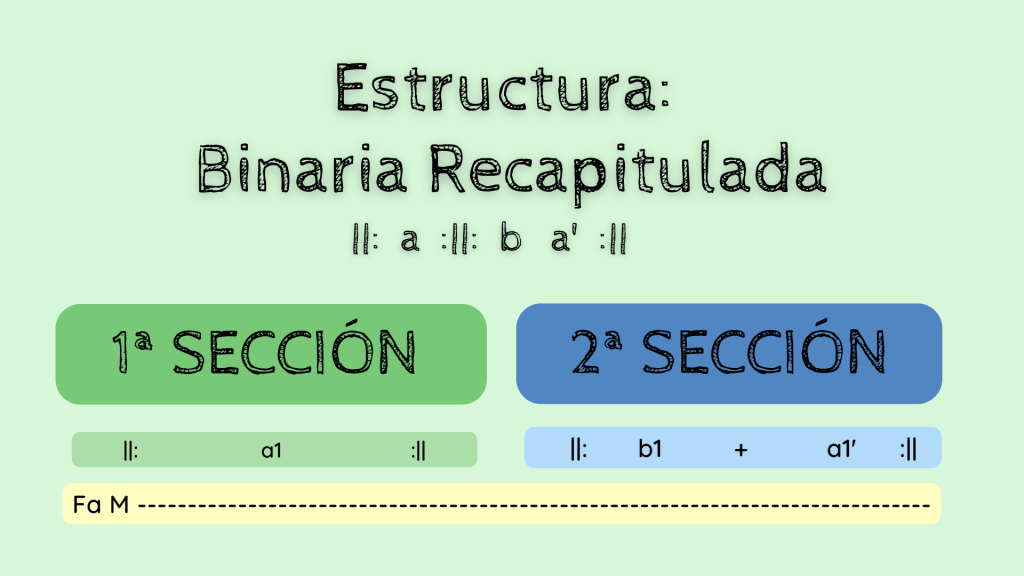 Esta estructura se caracteriza por presentar dos secciones claramente divididas por las dobles barras y por tener un material melódico muy unificado en torno a una idea musical. La textura utilizada ha sido mayormente la homofonía (aunque como suele ocurrir siempre, ésta es en realidad una melodía acompañada). Aunque también hemos visto la monodía y la frase a1 y b1.