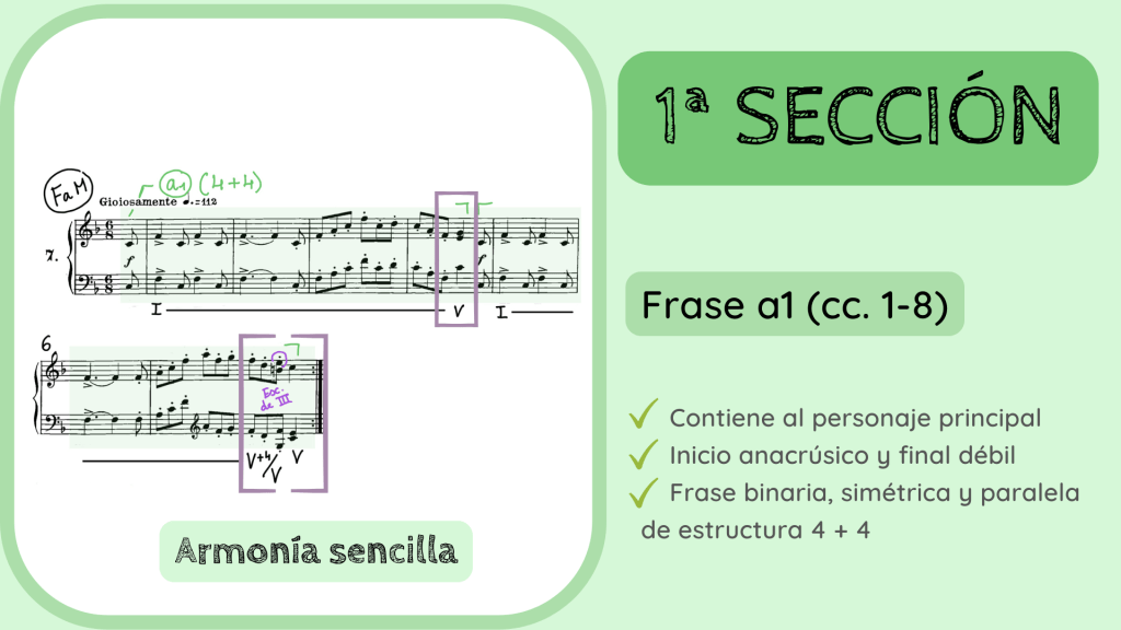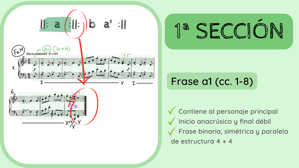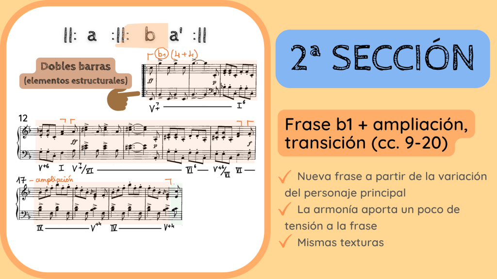Como últimos dos detalles mencionar que, por un lado, la frase a1’ es binaria, simétrica y, a pesar de los cambios, sigue siendo paralela porque ambas semifrases son exactamente iguales. Por otro lado, al finalizar la frase a1’ vemos las dobles barra de repetición que nos hacen regresar a la frase de transición b1 y otra vez a1’.