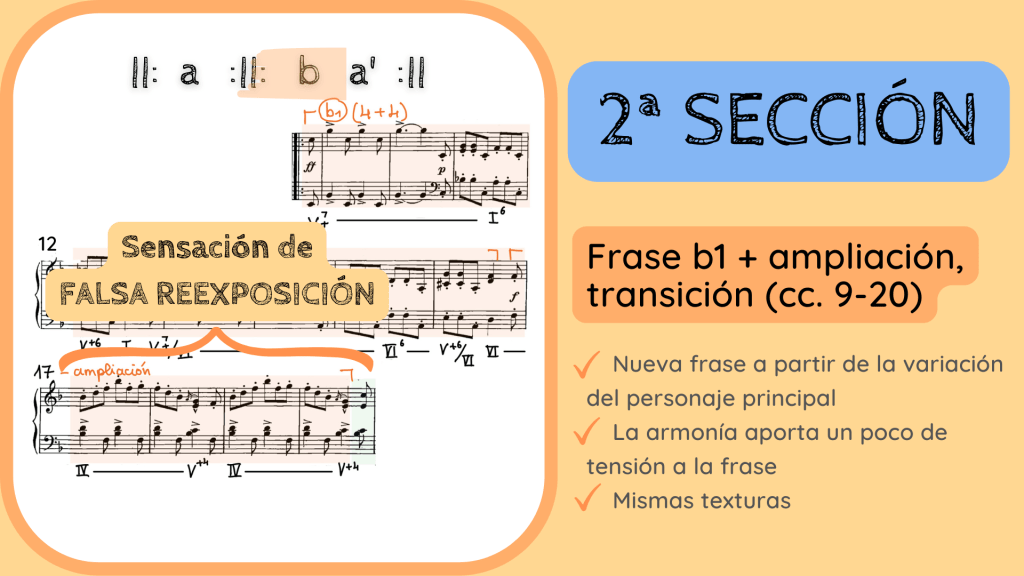 Cuando surge este añadido que hemos definido como una ampliación escuchamos lo que es la segunda parte de la semifrase original de a1. Es decir, que tenemos la impresión de que la obra ha regresado a la idea original en la tonalidad original; vaya, como una reexposición. Pero no es así, porque eso sucede justo después, en el c. 21 con anacrusa, con el mismo inicio melódico de a1. Es decir, que estamos ante lo que se conoce como una Falsa reexposición.