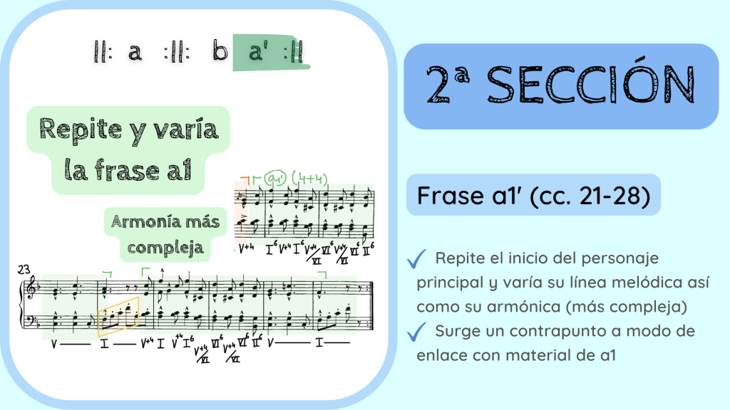 Otro cambio lo vemos en la continuación de la propia melodía que está alterada. A partir del c. 22 con anacrusa, apenas el inicio de la frase a1’, ya vemos que la melodía realiza una breve modulación hacia el tono relativo de Re menor para finalizar la semifrase y volver a Fa Mayor. La 4ª Justa se secuencia ahora con las notas La-Re, tal y como está marcado en la diapositiva.