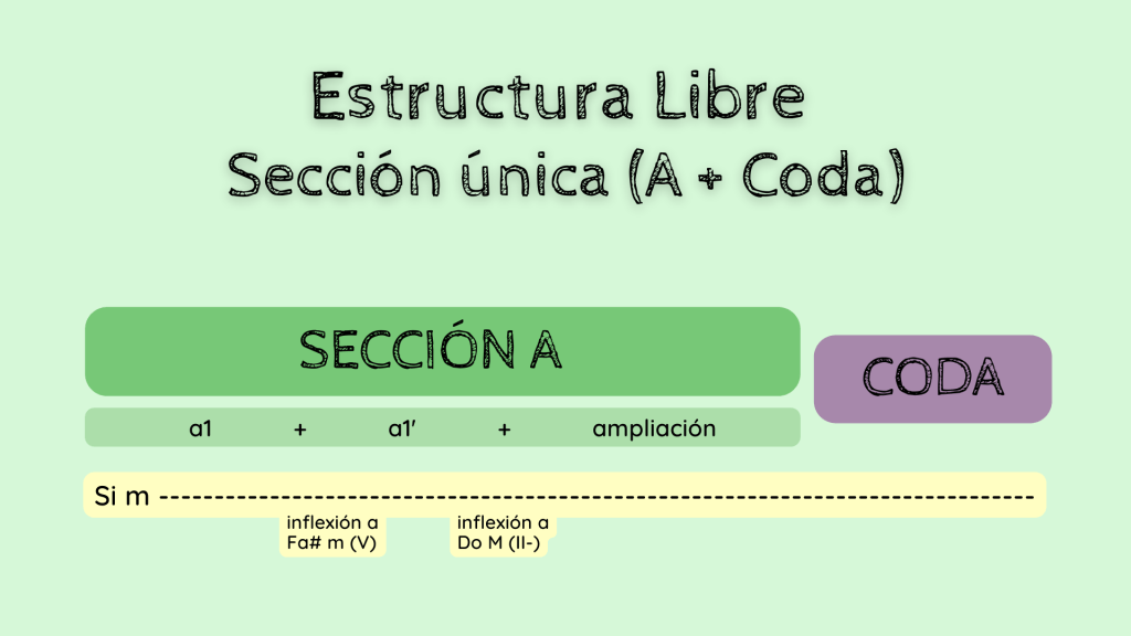 Concluimos este análisis con este esquema que refleja su estructura. Su única Sección A, en la que no se ha modulado (a excepción de las dos breves inflexiones) y compuesta por dos frases hace que no se pueda ajustar a ninguna estructura clásica. Es por ello que lo denomino como estructura libre.