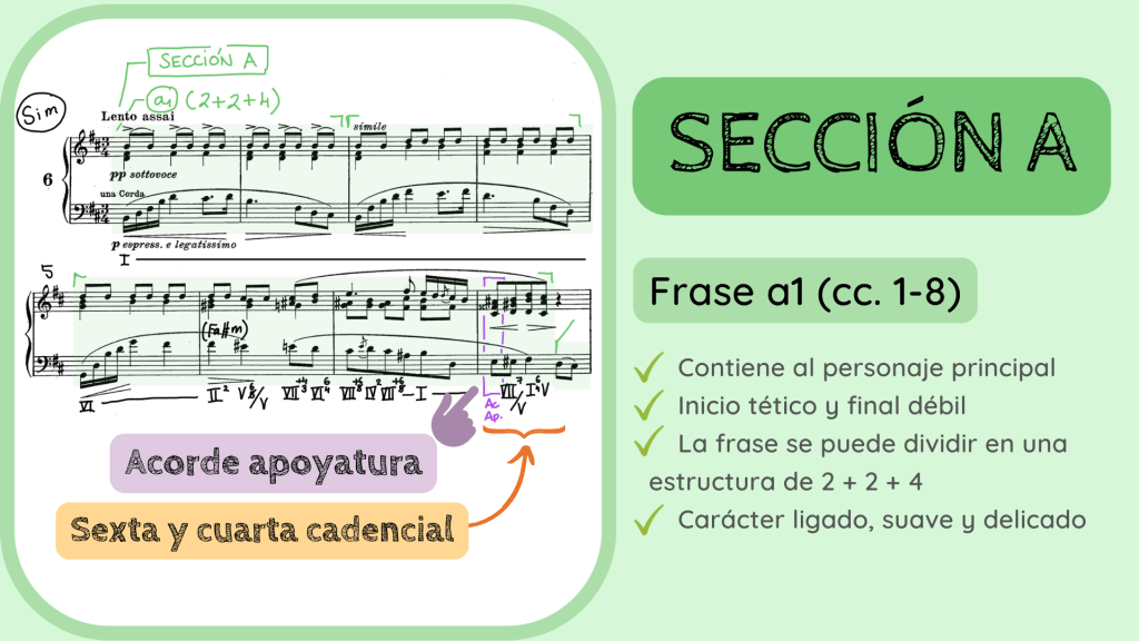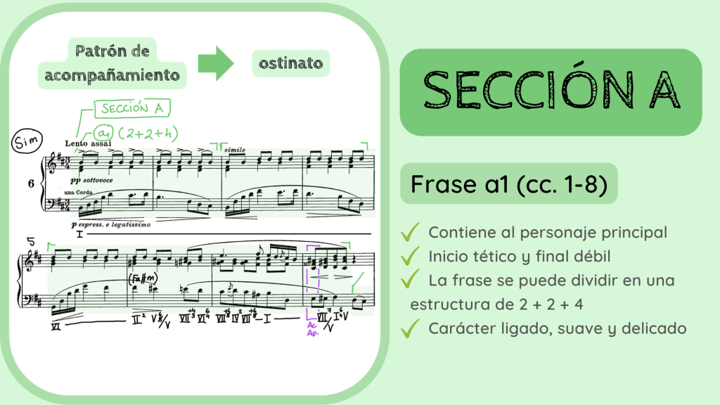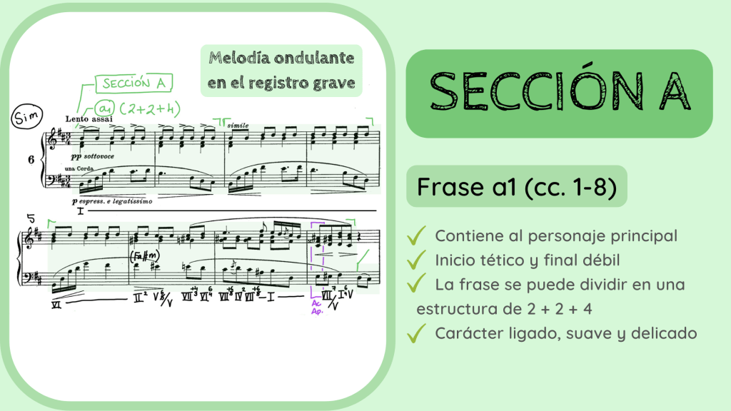 El personaje principal que he denominado como a1 arranca en el registro grave, con una articulación que deja clara la propia estructura del fraseo en 2 + 2 + 4. Sé que es el personaje principal porque justo después volverá a escucharse y recordad que si un compositor te repite una idea musical y, además, te la coloca nada más comenzar la obra, es que sin duda, es un elemento muy importante. Las tres semifrases que conforman esta frase se inician más o menos igual, con el mismo arpegiado ascendente a semicorcheas que, cada vez que se repite (en los cc. 1, 3 y 5) despliegan un registro cada vez más amplio y expresivo. El carácter del tema es suave, delicado y ligado y destaca de él su movimiento oscilante.