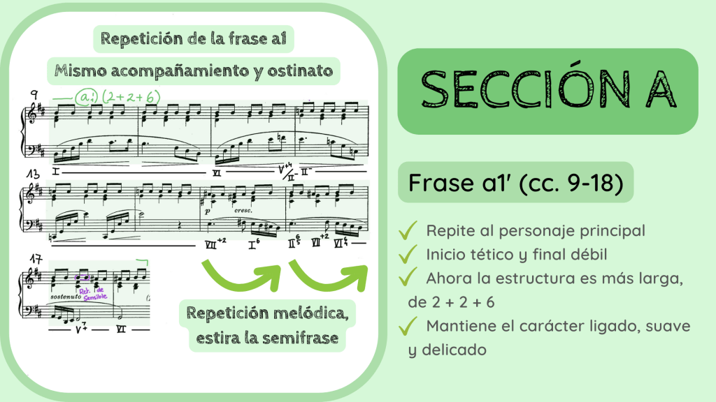 La siguiente frase, que se inicia con esa breve anacrusa, se encarga principalmente de repetir al personaje principal. Continua con la melodía en la mano izquierda y registro grave, así como con el mismo acompañamiento y carácter. Para las diferencias tenemos que centrarnos en otros dos aspectos: por un lado en su estructura fraseológica y, por otro lado, en la armonía. Primero comentamos su estructura, que vuelve a ser 2 + 2 + 6 (aunque estos últimos seis se pueden subdividir, perfectamente, en 2 + 4). Pero lo importante no es el nivel de detalle para especificar el fraseo, sino entender que la frase ahora es más extensa ya que se nos presenta una repetición melódica que antes no estaba, la de los cc. 15-16.