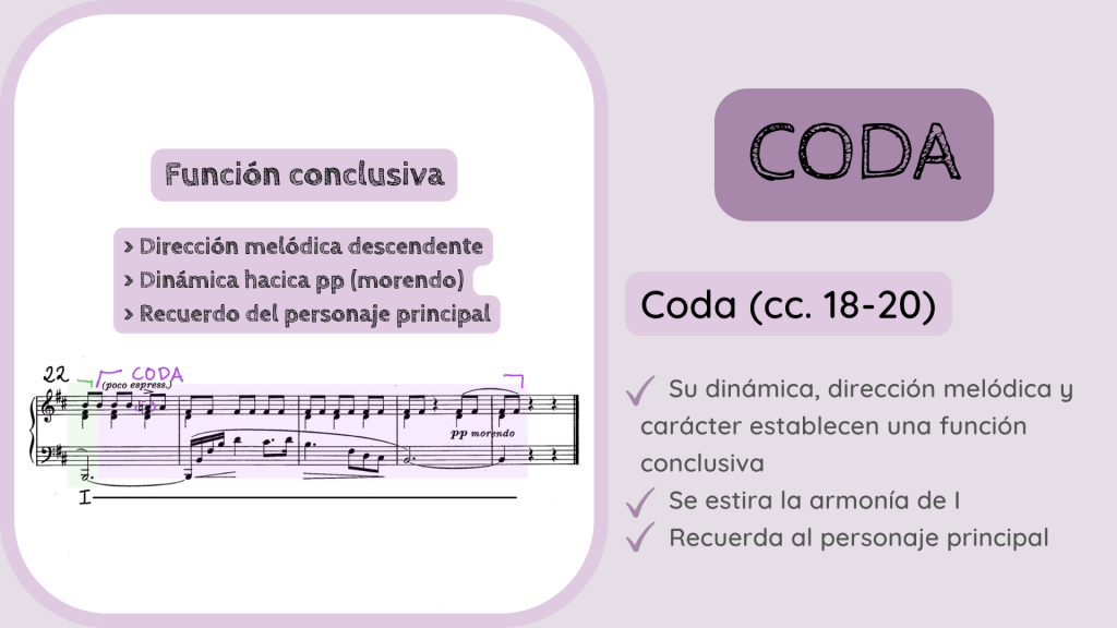 Aparece tras la contundente Cadencia Auténtica esta extensión de lo que básicamente es un acorde de tónica. Y podemos entender que se trata de una Coda, además por varios motivos. El primero es por la dirección melódica descendente que siempre da un sentido cadencial, de cerrar una frase. Lo segundo es la dinámica que también nos está reflejando una paulatina desaparición hacia el pianissimo y la indicación de morendo. El tercer y último factor que nos indica que esto es una Coda es que la melodía no es otra cosa que una variación del protagonista, como un recuerdo lejano de este que va desapareciendo poco a poco.