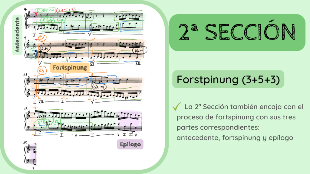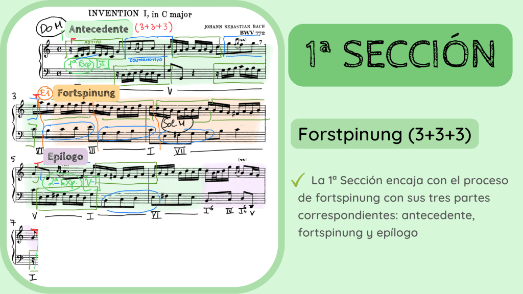 Todo este proceso compositivo de forspinung que, además, finaliza con un tajante punto cadencial, lo podríamos considerar como una 1ª Sección. Es decir, que la jerarquía estructural es la siguiente: la invención se divide en secciones, las secciones se dividen en exposiciones, episodios y puntos cadenciales y éstos se forman a partir del M y CM.