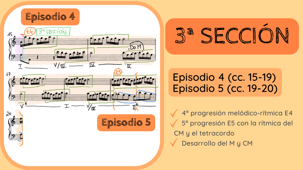 Y otra vez, si nos alejamos y observamos todo lo que ha ocurrido en esta 2ª Sección entenderemos el proceso compositivo de fortspinung. La primera parte, el antecedente, tiene su función expositiva con esa 3ª exposición en Sol Mayor donde se nos presentaba el M y CM, casi en versión original. La siguiente parte es el fortspinung en la que las ideas principales se presentan en una o varias progresiones. En este caso han sido dos, que hemos denominado como E1 y E2. Y todo ello nos ha conducido hasta la tercera y última parte con función conclusiva que denominamos epílogo y que cierra todo el forspinung. Es aquí donde, como ya hemos comentado, volvemos a tener una exposición, la n.º 4, que no es del todo clara y que más bien es un pasaje que nos conduce hasta el punto cadencial.