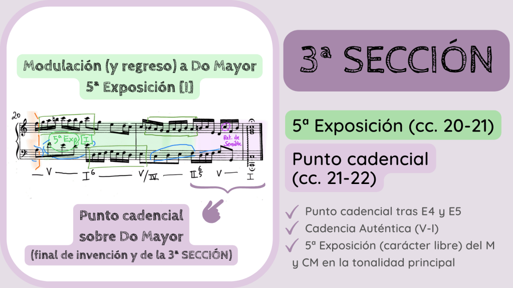 Y así, hacia el final, reaparece la tonalidad de Do Mayor en la última Exposición, la n.º 5, que presenta las ulteriores apariciones del M en ambas voces. Y, como no puede ser de otra manera, las voces se ponen de acuerdo hacia el final, con esa textura de nuevo más acórdica y homofónica que marca un último punto cadencial para cerrar la 3ª Sección y la invención.