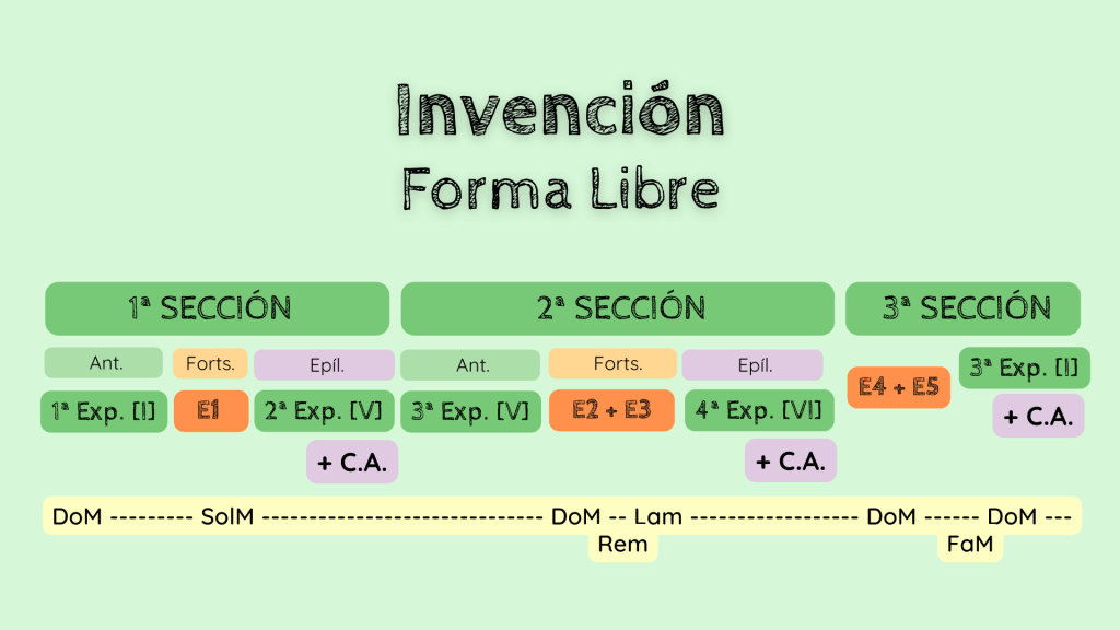 Para terminar, como siempre, os dejo este esquema formal de la obra en el que se puede observar la distribución de las principales partes de una invención: exposiciones, episodios y puntos cadenciales. En esta invención las dos primeras secciones nos han encajado con el proceso barroco de fortspinung (hecho que no tiene por qué suceder siempre). Pero recordad que el orden de las partes es totalmente distinto en cada invención que se analice y que, este género musical, se construye en base a dos elementos melódico-rítmicos principales: M y CM. Y en base a la forma y función con las que aparecen tendréis que determinar si exponen en una tonalidad con sus formas originales (exposiciones) o si se desarrollan a través de progresiones (episodios). Así es como podréis ir definiendo la forma de la invención.