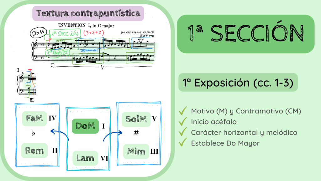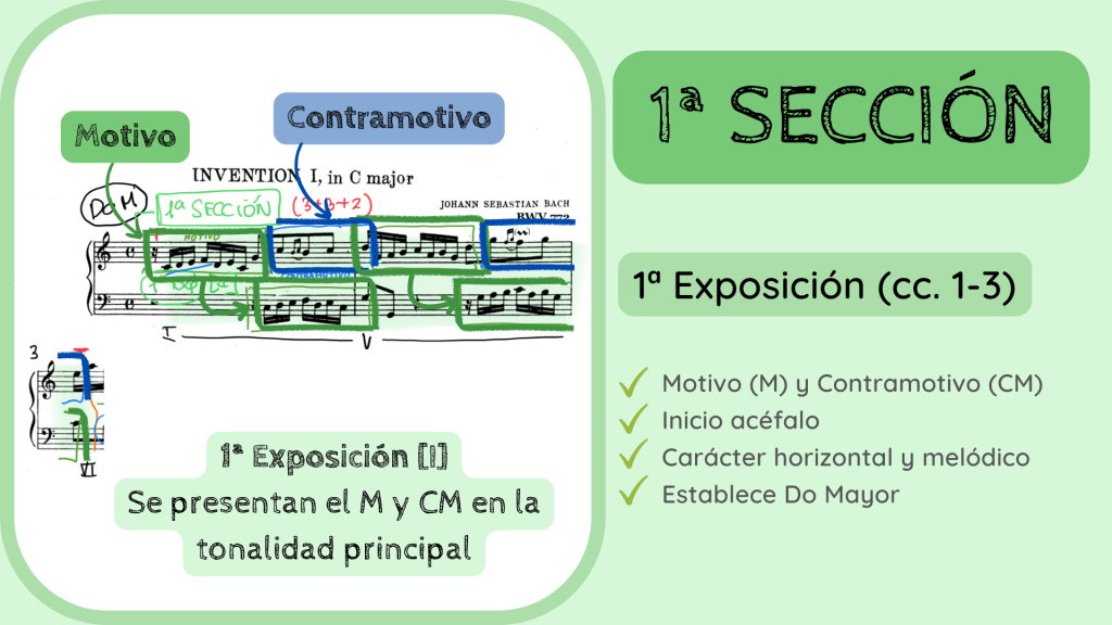 Como el objetivo es presentar estos elementos melódicos esta primera parte de la invención es una exposición. Recuerdo que la invención, en cuanto a su estructura, es la sucesión de exposiciones, episodios y puntos cadenciales, por lo tanto, en el análisis los vamos a ir numerando. Estamos ante la Exposición n.º 1 y en la tonalidad principal de Do Mayor. Es importante marcar en qué tonalidad con respecto a la principal se está produciendo la exposición ya que puede haber desde una o más.