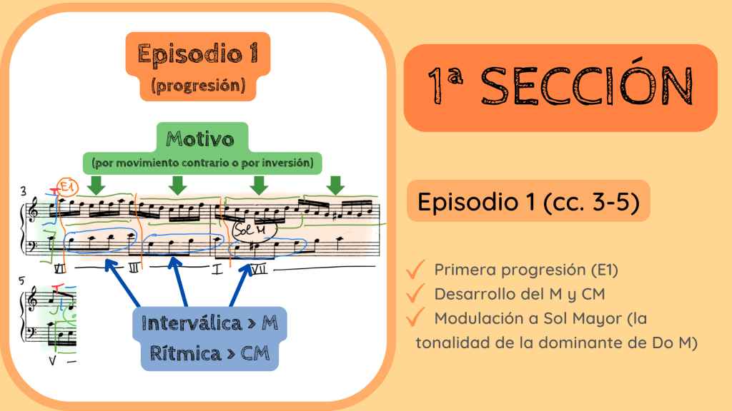 Durante los siguientes dos compases la voz superior, toda a semicorcheas, vemos cómo secuencia hasta cuatro veces seguidas el motivo. Cada vez que lo repite lo vemos a una 3ª descendente con respecto al anterior y, por cierto, no en su forma original interválica sino que está imitado por movimiento contrario, con los intervalos invertidos en su dirección. Es decir, que estamos ante otra de las partes principales de una invención: el episodio o divertimento. Básicamente esta parte se define por una progresión o desarrollo de los materiales melódicos principales. Lo numeramos pues como el Episodio 1. De hecho, si nos fijamos en la voz inferior veremos que no sólo secuencia el motivo sino que ésta realiza un movimiento de tetracordos que nos recuerdan al motivo y, encima, con una rítmica a corcheas que proviene del contramotivo. También se podría considerar que Bach ha realizado una imitación del M por aumentación en la voz inferior. Antes de pasar a la siguiente diapositiva quiero que os fijéis en el color que he utilizado: el naranja. Es el que utilizo para simbolizar que este fragmento tiene una función de desarrollo o transitiva.