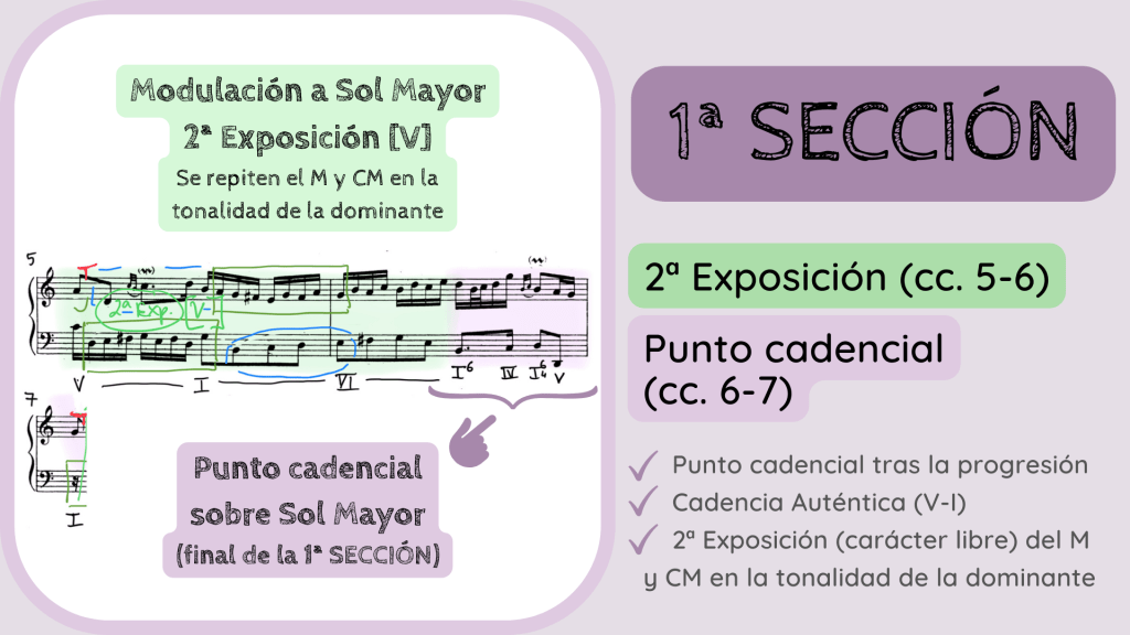 A partir del c. 5 vemos cómo de nuevo aparecen el motivo y contramotivo pero esta vez con una serie de particularidades. Ahora se nos presentan en una nueva tonalidad de Sol Mayor, la dominante de la principal. Es decir, que aparecen en una suerte de exposición n.º 2 pero ahora en otra tonalidad. Y digo suerte de exposición porque no lo es totalmente. Sí tenemos el motivo claro al principio del c. 5 en la voz inferior pero cuando se repite en la voz superior está por movimiento contrario. No es una aparición del todo clara y es que Bach tiene previsto conducirnos hacia un punto cadencial en el tiempo fuerte del c. 7 (que además está reforzado por la anticipación de la Tónica en la melodía, un cliché del Barroco) y es por ello que esta exposición se queda coja, sin tener esa función expositiva tan clara y en cambio sí una función conclusiva, por eso ahora la diapositiva está de color morado. Pero, ¿por qué esta ambigüedad en la exposición n.º 2? Pues la respuesta la tenemos si alejamos el zoom de la partitura y vemos con perspectiva todo lo que ha ocurrido.