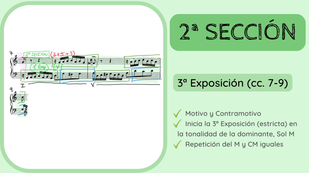 La 2ª Sección da comienzo en el c. 7 con inicio acéfalo. Ahora sí se nos presentan el M y CM en la tonalidad de Sol Mayor pero de forma más completa y similar a la exposición original. Me refiero más que antes. Ahora estamos en la 3ª exposición (aunque se podría considerar la 2ª si no se tiene en cuenta la anterior). Las dos ideas principales mantienen sus características interválicas y rítmicas.