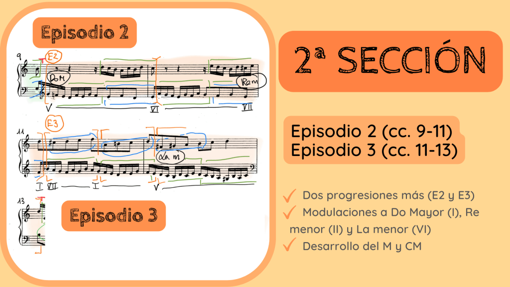 Cómo no, ahora la exposición continúa con una progresión que dura de los cc. 9-11. Se trata de una secuencia en la que aparece imitado el M por movimiento contrario alternado en las dos voces y, a modo de complemento, tenemos la rítmica a corcheas del CM. La tonalidad se desplaza de nuevo hacia la tónica, a Do Mayor, para enseguida modular con el Do# del final del c. 10 hacia Re menor, el II con respecto a la tonalidad principal. Acto seguido vemos que se inicia otra secuencia de los cc. 11-13 con los mismos elementos del M y CM pero aparecidos de forma distinta. Es por ello que hemos denominado a esta nueva progresión como Episodio 3. De nuevo la rítmica del CM está presente y también el uso del tetracordo.