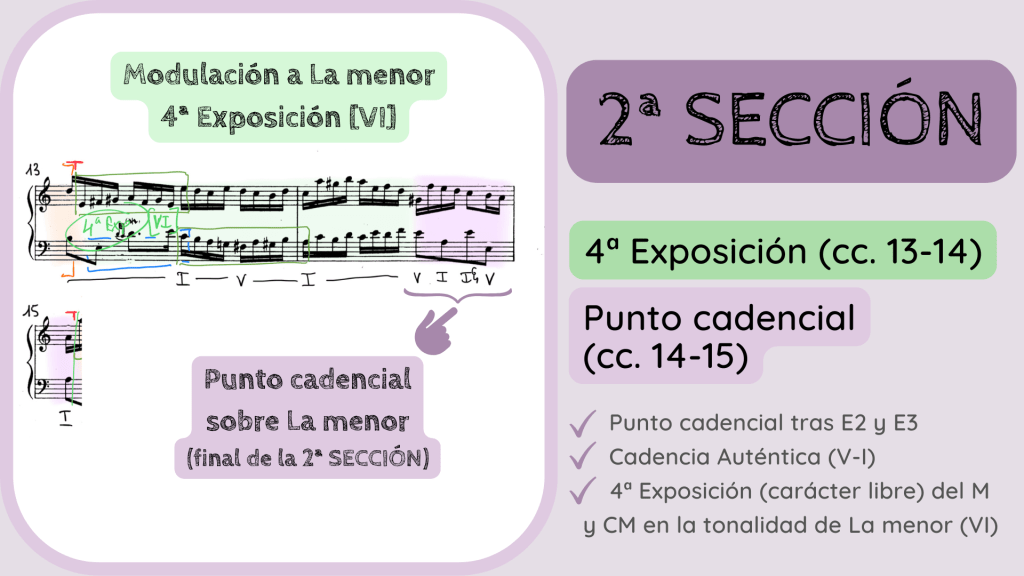 Al igual que sucedía en la 1ª Sección da comienzo lo que parece ser una nueva exposición del M y CM en la tonalidad de La menor, el VI con respecto a la tonalidad principal. Ocurre de nuevo que no se llega a definir una exposición con claridad ya que, hacia la segunda mitad del c. 14 aparece con rotundidad, con una textura más bien acórdica, un punto cadencial que define el final de la 2ª Sección. De nuevo la melodía realiza una anticipación de tónica.