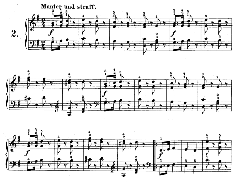 La repetición literal, como ya se ha mencionado, casi nunca sucederá. Estos ejemplos han sido elegidos a propósito. Uno se trata de una pieza infantil para piano con un fin pedagógico y la otra es una danza de una suite Barroca, en la que la estructura siempre se repetía en cada una de las danzas. La repetición tenderá a la variación.