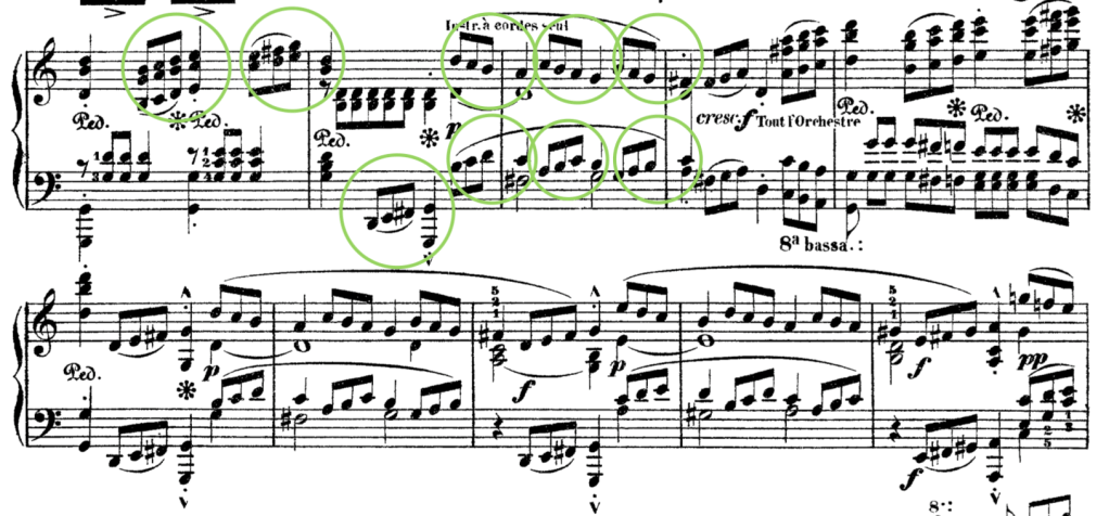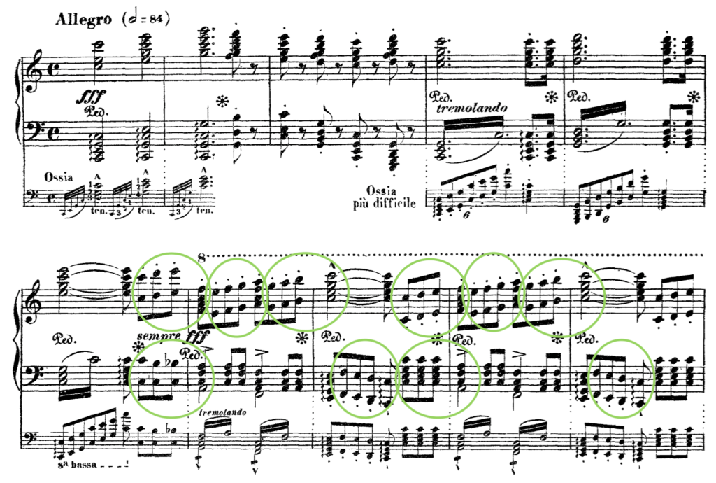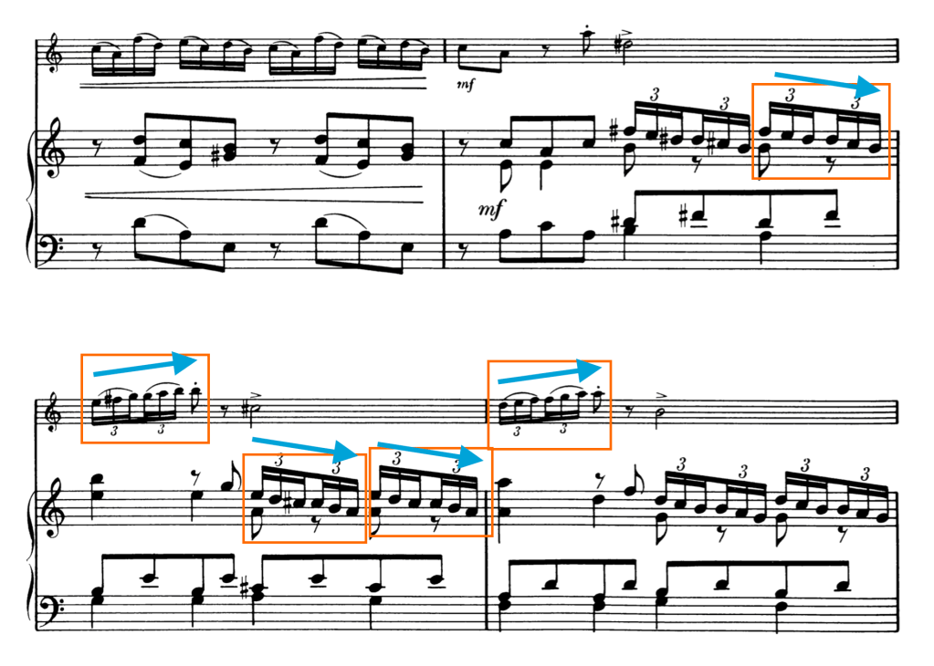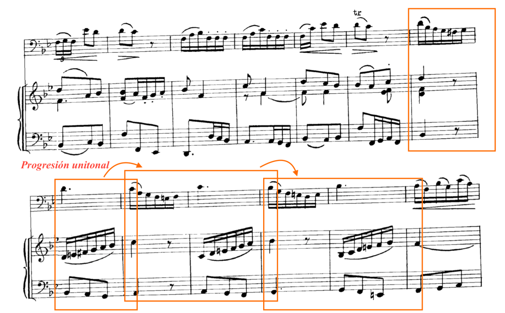 Los próximos ejemplos son progresiones unitonales. Por un lado, el Trio Op. 45 de la compositora Loise Farrenc en el que presenta, a final de la primera sección del movimiento, una progresión que nos conduce al cierre de dicha sección. Esta progresión es de naturaleza unitonal. Además, hay una textura contrapuntística definida por el piano (que realiza dos voces a intervalos de terceras paralelas) y la imitación en la flauta y el violonchelo (que también se mueven mediante terceras paralelas).