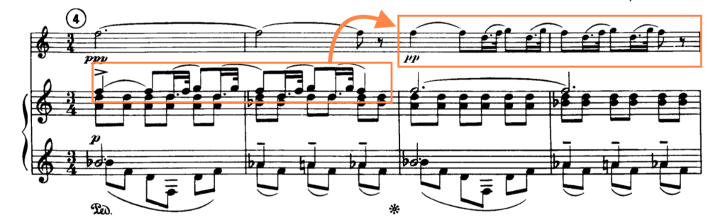 Vamos a aclarar estos principios. La repetición y variación son claras. La diversidad podría tratarse de una obra en la que se presenta una melodía con un acompañamiento determinado y, cuando se repite la melodía, surge un acompañamiento totalmente distinto. El resultado es un carácter diferente de la repetición de la melodía, pero ambas siguen siendo la misma idea musical. O, por ejemplo, en una obra cuando un mismo motivo melódico-rítmico aparece en dos o más movimientos, transformado (véase las figuras 4b, 4c y 4d). El contraste podría darse entre la oposición de una sección de la obra en Do mayor, con carácter enérgico y sonoridades densas y otra sección en La menor, con dinámicas suaves y sonoridades muy ligeras; ambas secciones se necesitan la una de la otra para generar ese desigualdad. El proceso de carencia de relación será muy difícil de hallar en ejemplos musicales, habría que escapar del sistema tonal e ir al repertorio del siglo XX o XXI. Algunas obras ilustrativas de este proceso de carencia de relación podrían ser: el Concerto Grosso No. 1 (1977) de Alfred Schnittke, escrito para 2 violines, clave, piano preparado y orquesta de cuerdas; La pregunta sin respuesta (1906) de Charles Ives; la Sonatina “Death of the Machines” (1922) de George Antheil.