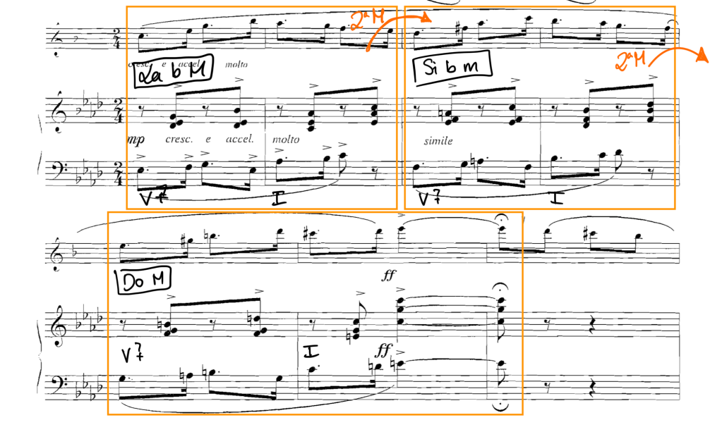 Las progresiones son transposiciones de un modelo (ya sea una frase, semifrase o, simplemente, un fragmento musical) a un mismo intervalo. Como ya sabréis de haberlas realizado en ejercicios de armonía, las progresiones pueden ser modulantes o no modulantes (llamadas unitonales).