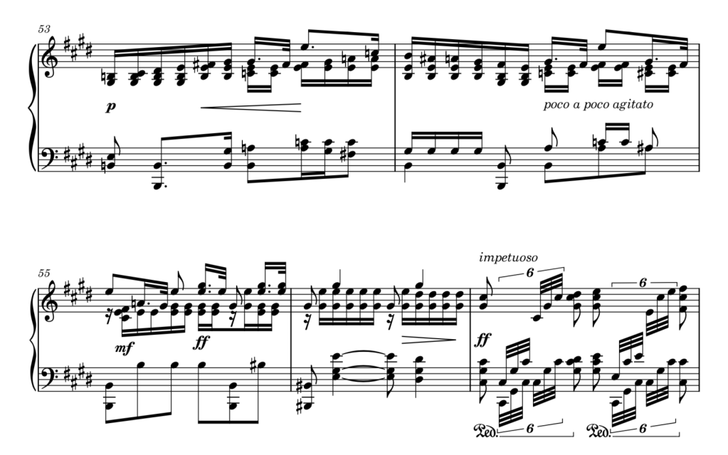 En ocasiones el aceleramiento también se puede dar con, a parte de lo mencionado, anotaciones referentes al carácter como se puede ver en el siguiente ejemplo de la compositora sueca Valborg Aulin. En él, el aceleramiento métrico se ve reforzado, además de por la acumulación, por las indicaciones de poco a poco agitato, impetuoso y molto sentimento, que generan aún más tensión en el discurso.